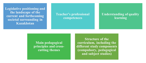 The core curriculum has been created based on various documents and deliverables from the Strengthening Initial Teacher Education KZEMP/QCBS-03 project, including a comprehensive Needs analysis of the current situation and development needs of initial teacher education in the Republic of Kazakhstan and the enhanced model of ITE.