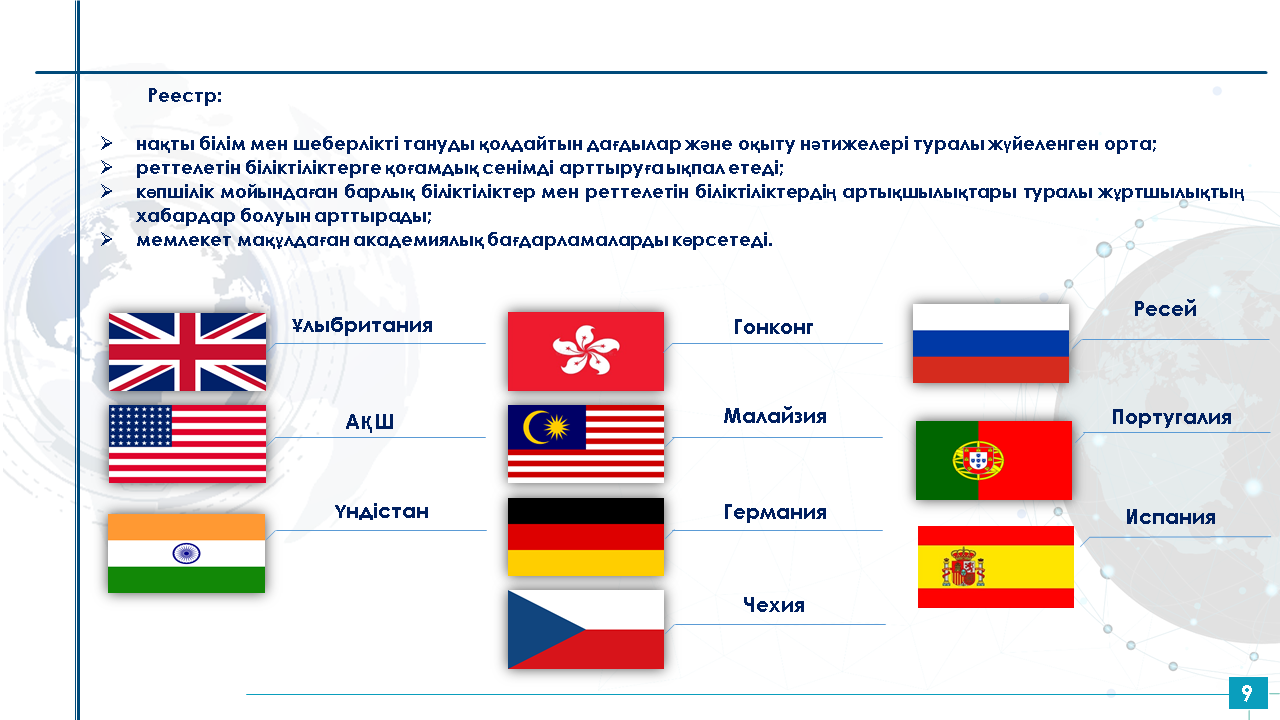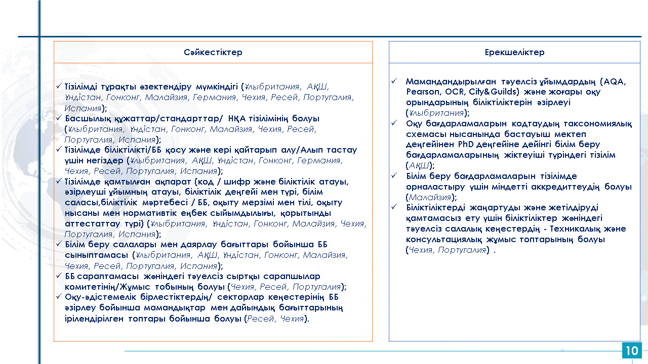 Болон процесі және академиялық ұтқырлық орталығы бірқатар елдерде (Ұлыбритания, АҚШ, Үндістан, Гонконг, Малайзия, Германия, Чехия, Ресей, Португалия, Испания) білім беру бағдарламаларының (біліктіліктердің) тізілімін жүргізудің халықаралық тәжірибесіне жүргізген талдауы мыналарды көрсетті: