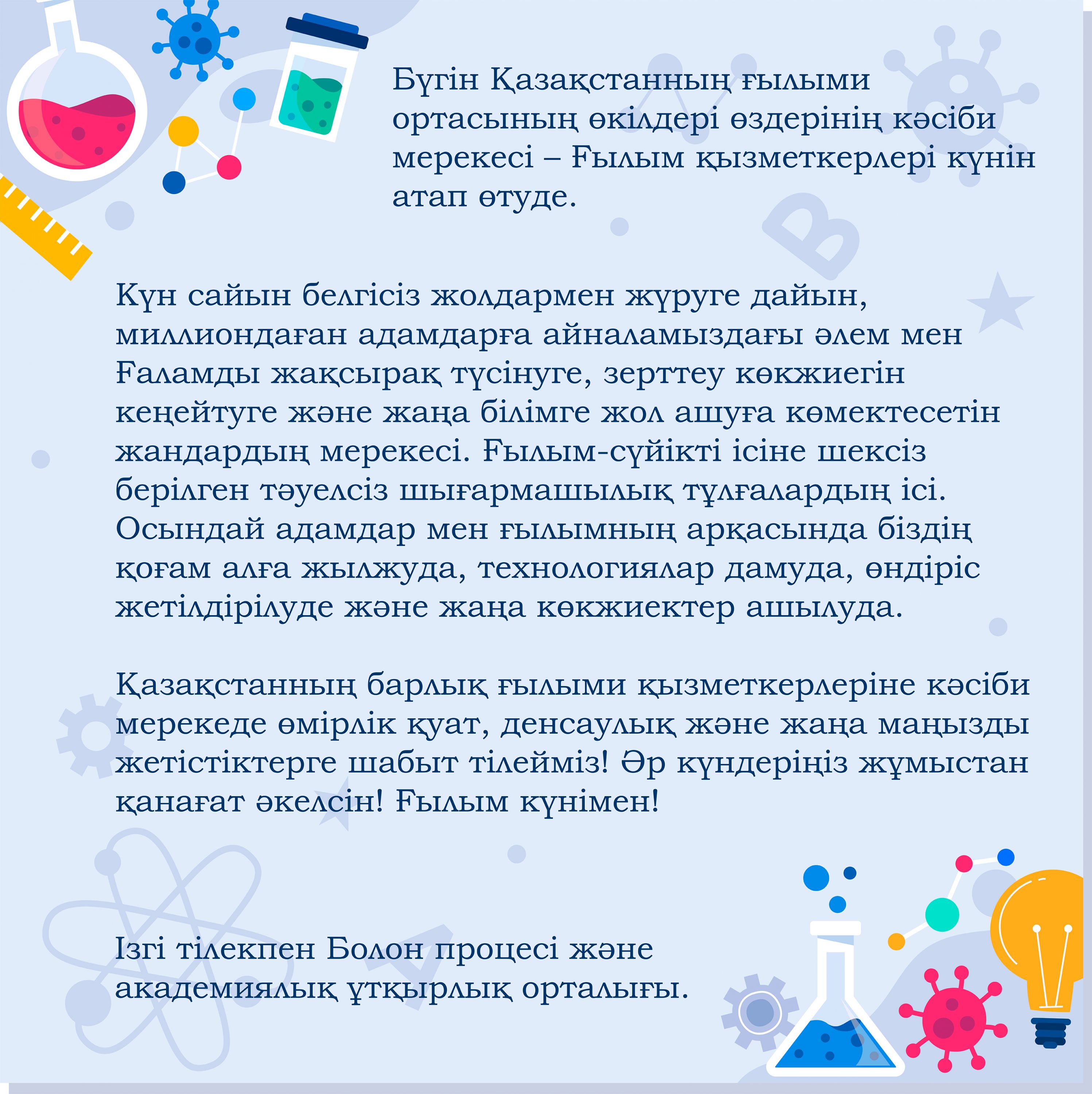 Қазақстанның барлық ғылыми қызметкерлеріне кәсіби мерекеде өмірлік қуат, денсаулық және жаңа маңызды жетістіктерге шабыт тілейміз! Әр күндеріңіз жұмыстан қанағат әкелсін! Ғылым күнімен!