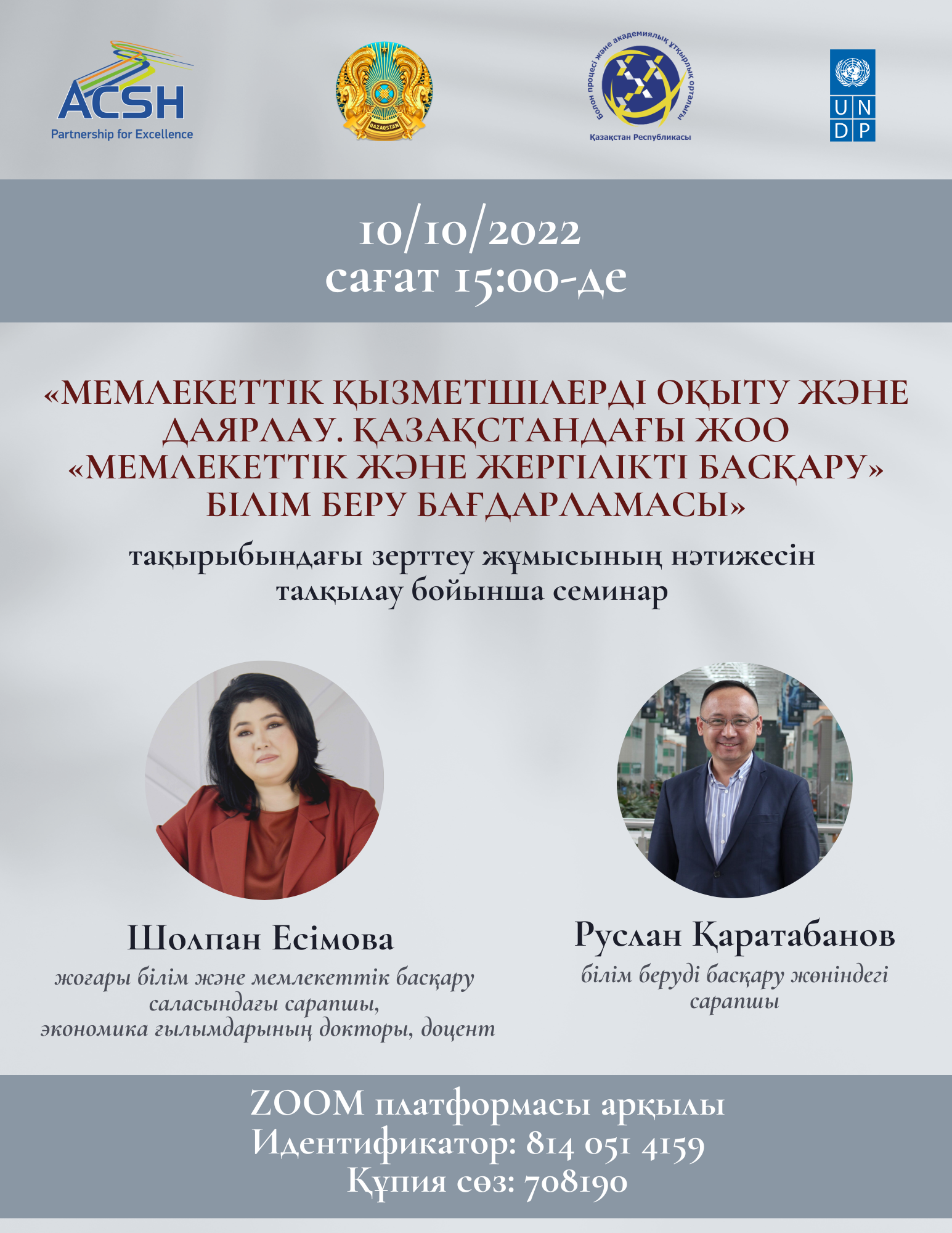 Болон процесі және академиялық ұтқырлық орталығы мен Астана мемлекеттік қызмет хабының бірлесе отырып, «Мемлекеттік қызметшілерді оқыту және даярлау. Қазақстандағы ЖОО «Мемлекеттік және жергілікті басқару» білім беру бағдарламасы» тақырыбындағы зерттеу жұмысының нәтижесін талқылау бойынша семинарына шақырады.