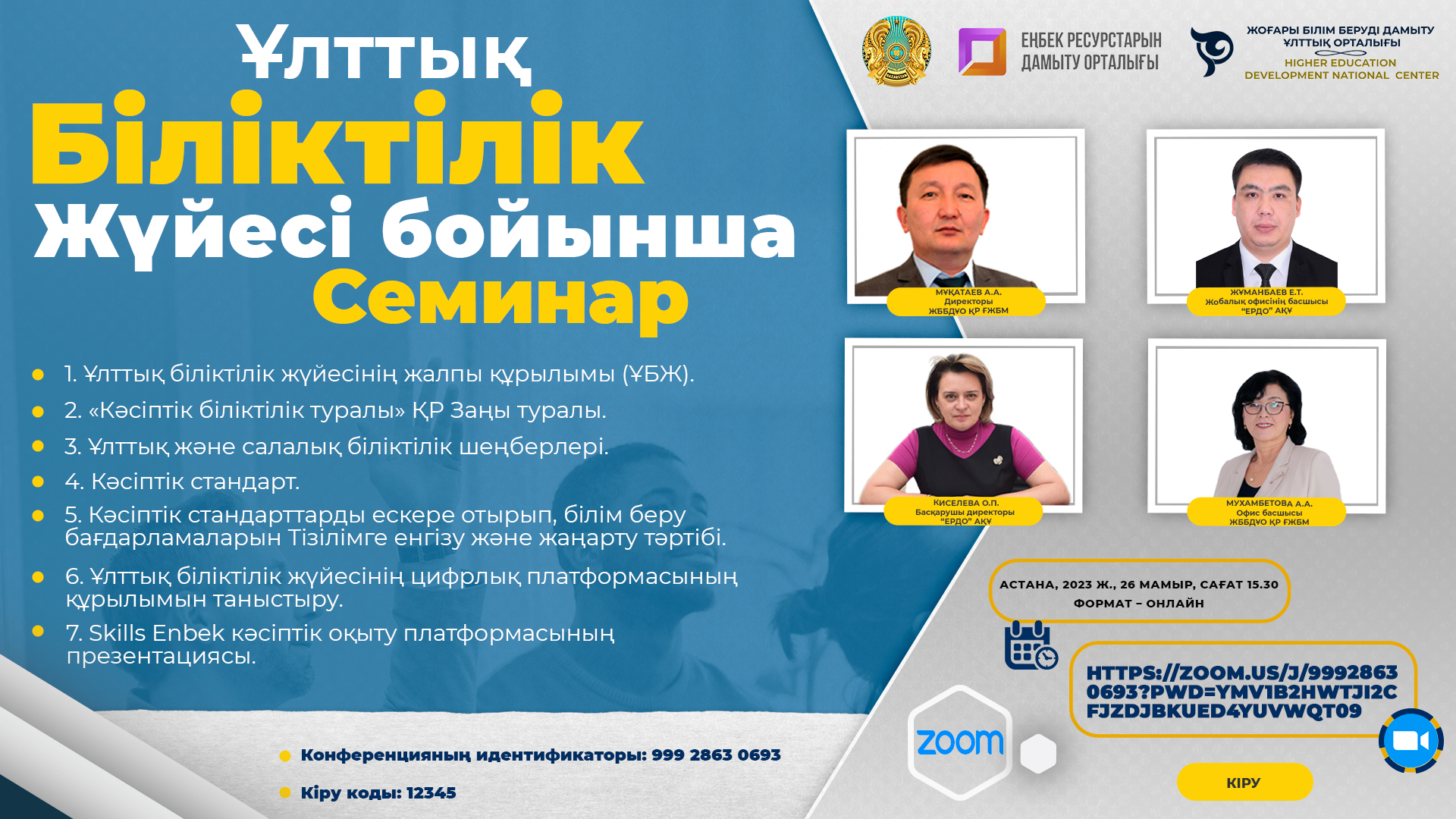 Өтетін орны: ZOOM (кіруге арналған сілтемені «Еңбек ресурстарын дамыту орталығы» АҚ Ұлттық біліктілік жүйесін дамыту жөніндегі жобалау офисі жолдайды)