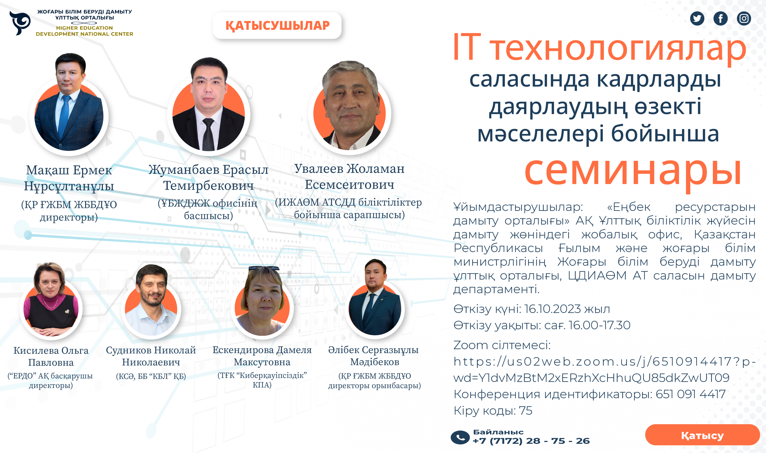 16 қазанда Жоғары білімді дамытудың ұлттық орталығы Адам ресурстарын дамыту орталығымен және ХҚАЖДМ Ақпараттық технологиялар индустриясын дамыту департаментімен бірлесе отырып, IT саласындағы кадрларды даярлаудың өзекті мәселелері бойынша семинар өткізді.