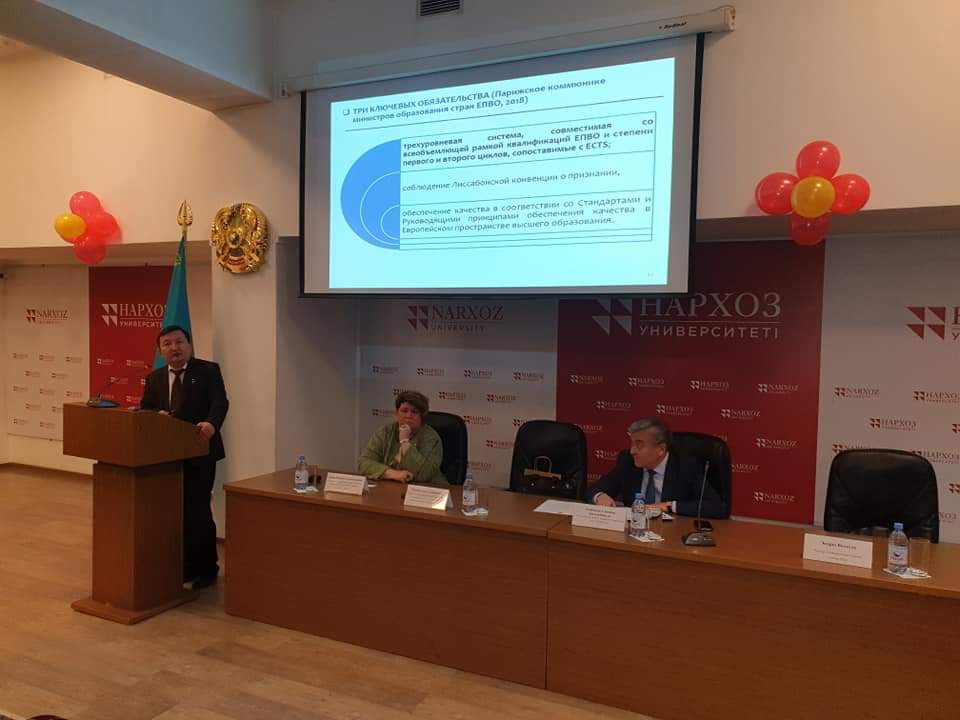 ҚР БҒМ Болон процесі және академиялық ұтқырлық орталығы «Бизнес және басқару» бағыты бойынша Оқу-әдістемелік бірлестіктің отырысына қатысты (2019 жылғы 6 мамыр, Алматы қ., Нархоз университеті).