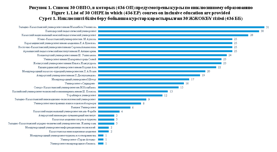 Следует отметить 30 ОВПО, в которых во всех включенных ими ОП (436 ОП), предусмотрены курсы по инклюзивному образованию (рис. 1).