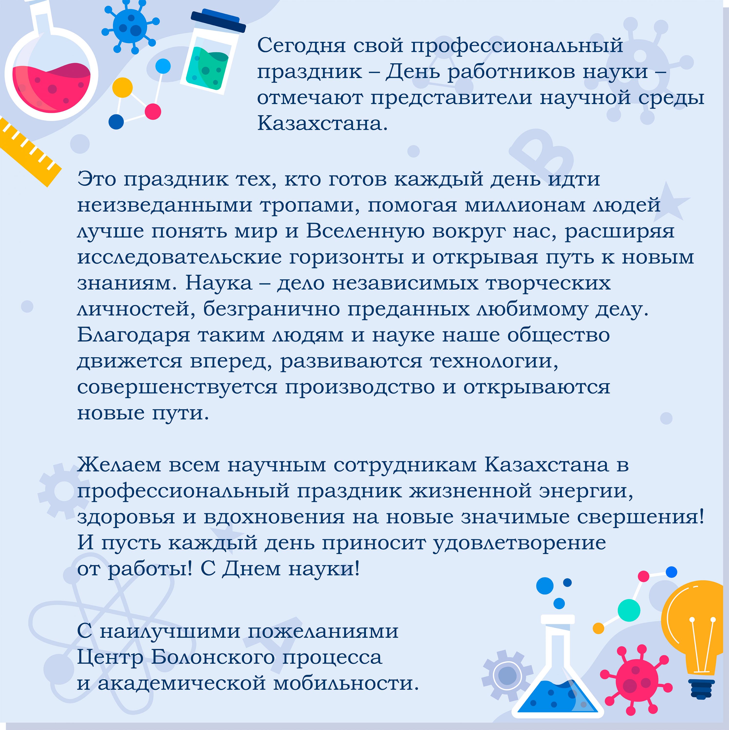 Желаем всем научным сотрудникам Казахстана в профессиональный праздник жизненной энергии, здоровья и вдохновения на новые значимые свершения! И пусть каждый день приносит удовлетворение от работы! С Днем науки!